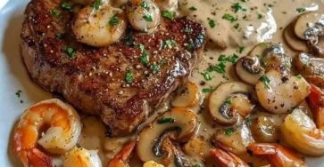 STEAK AND SHRIMP WITH MUSHROOM CREAM SAUCE