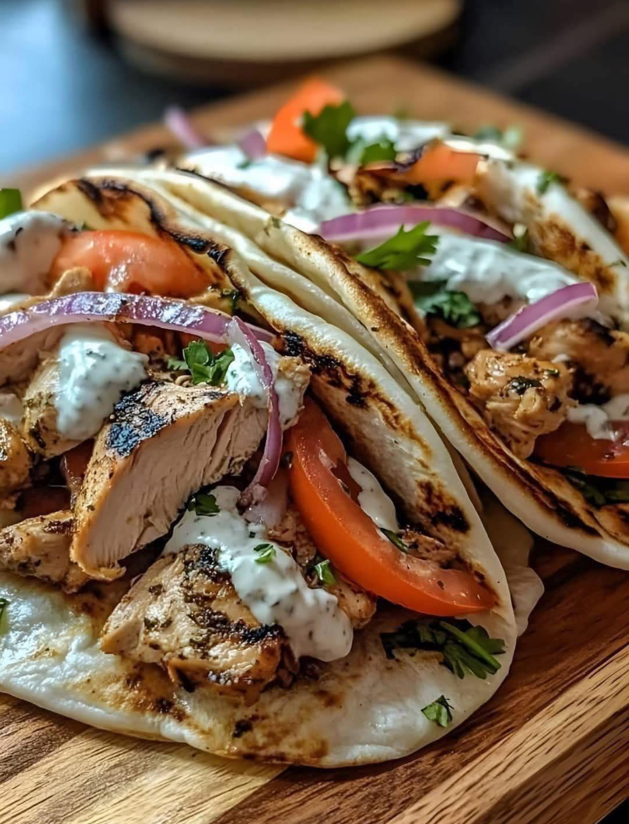 - Assemble the gyros: Warm the pita breads on the grill or in a dry skillet for a few seconds on each side. Layer each pita with the sliced chicken, tzatziki sauce, sliced tomatoes, red onions, and shredded lettuce. Roll up the pita around the fillings and wrap in foil for easy handling.