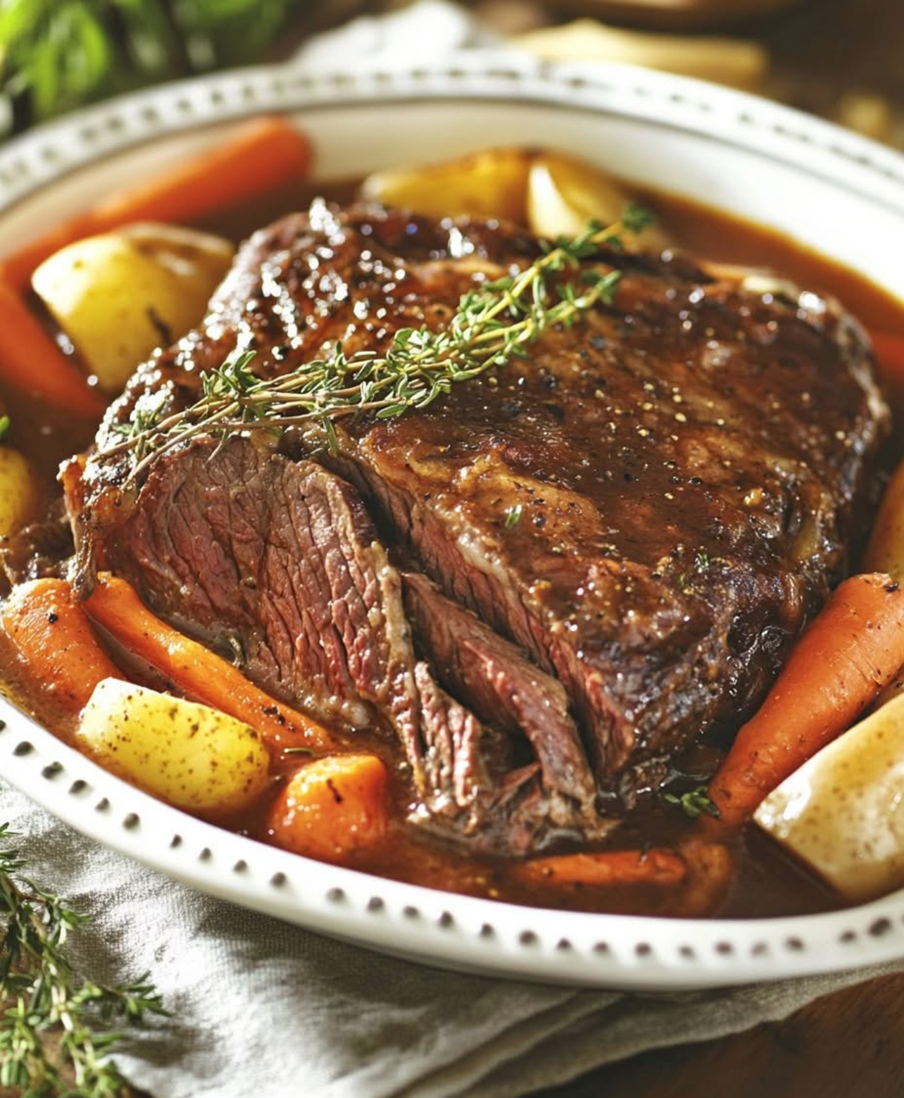 (Optional) For a thicker gravy, remove the roast and vegetables. Mix cornstarch with water and whisk it into the pot juices, simmering until thickened.
