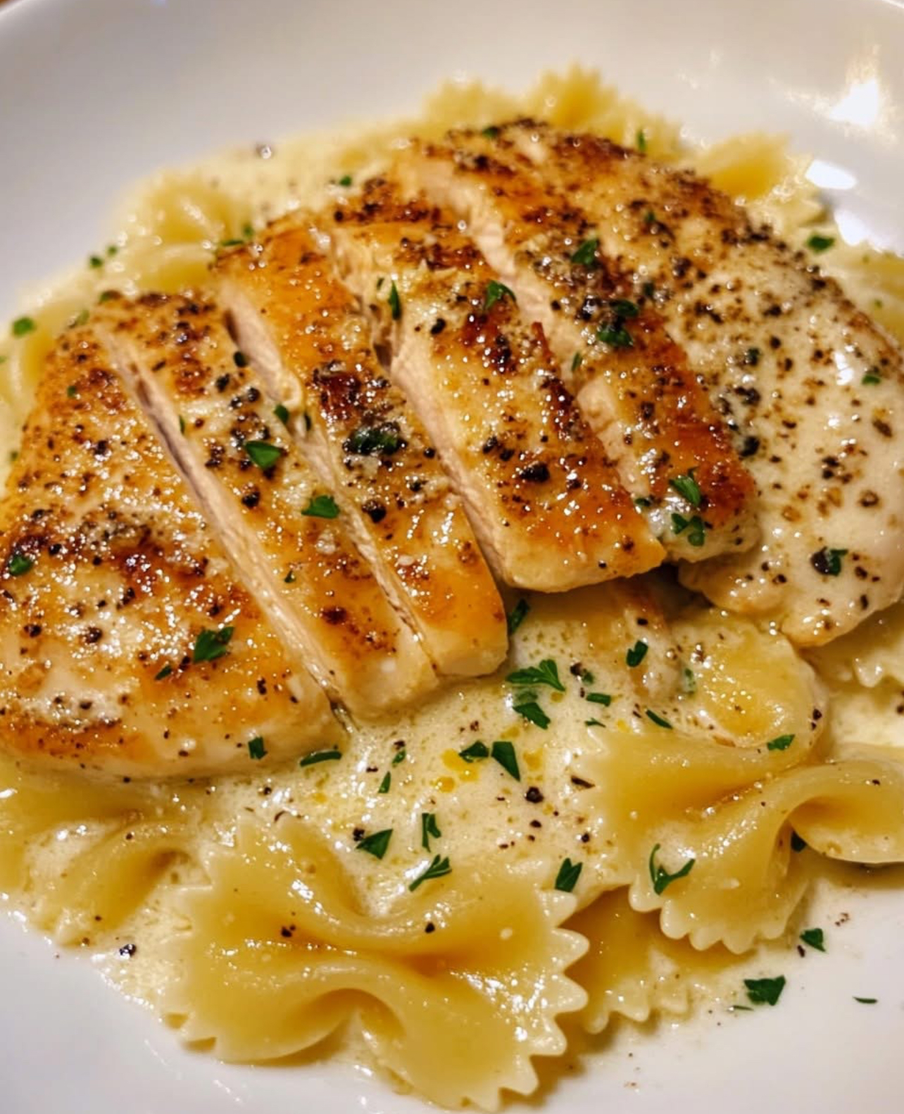 Serve with Chicken: Return the sliced chicken to the skillet and gently combine. Sprinkle with fresh parsley and serve hot for a fresh, tangy twist on creamy chicken pasta.