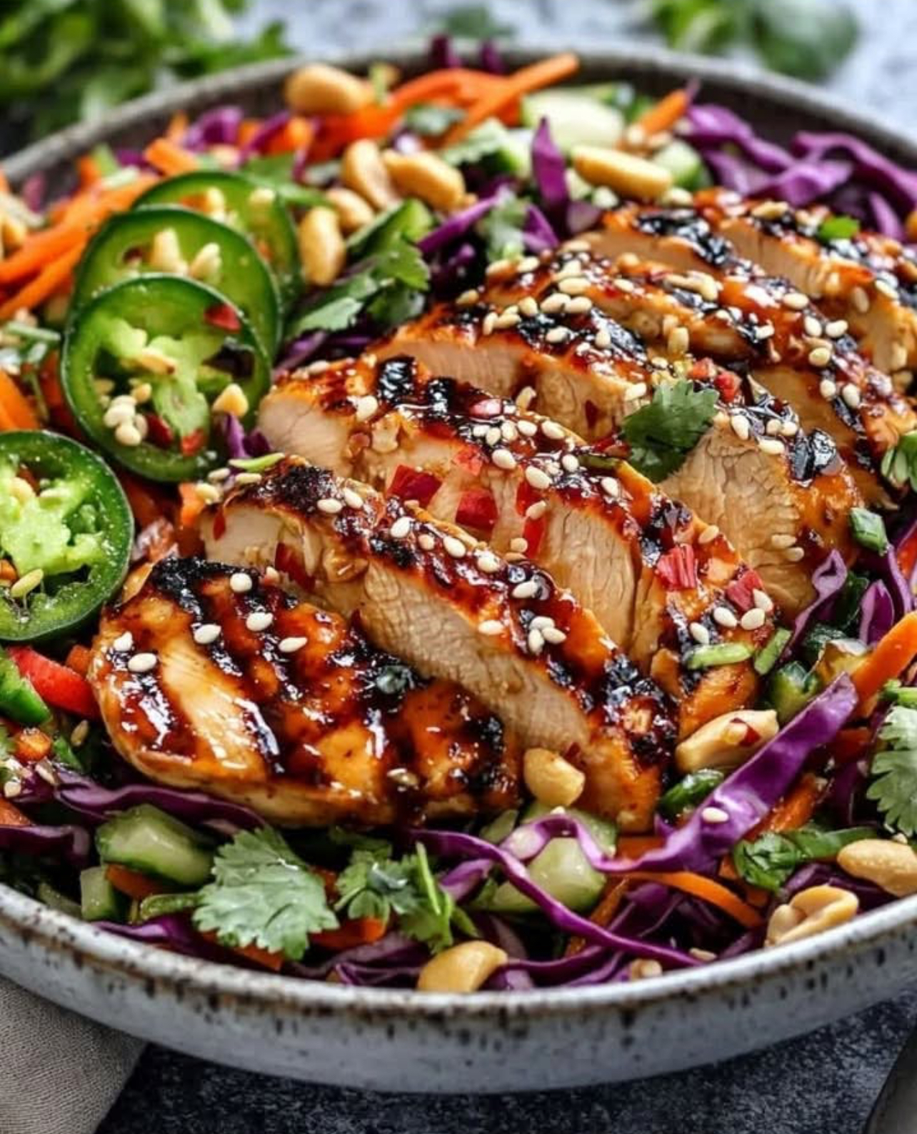 4️⃣ Assemble Salad: Add sliced chicken on top of the veggie base.