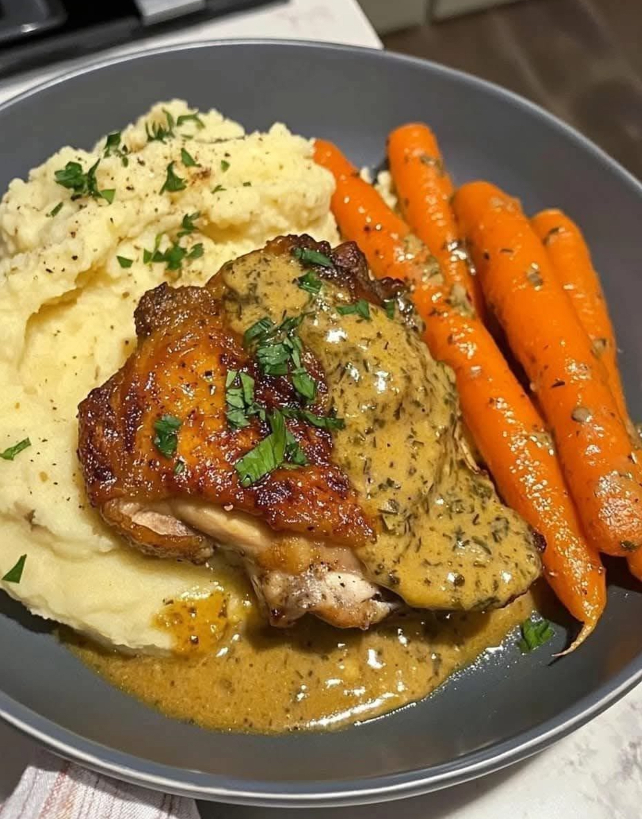 Spoon mashed potatoes into your bowl, top with the herb chicken and roasted carrots. Spoon over any pan drippings for an extra-savory finishing touch.