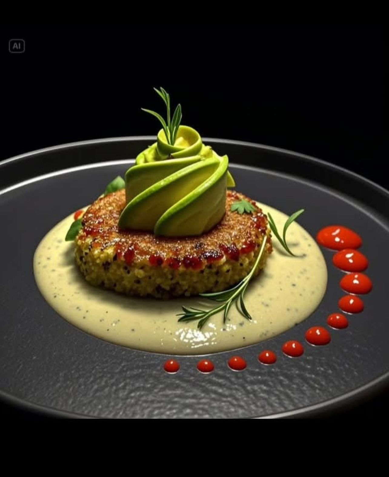 5️⃣ Plate with Elegance: Pour a generous pool of the lemon-tahini cream onto a dark plate. Place the golden quinoa cake in the center. Carefully lift the avocado rose and place it on top of the cake. Use a squeeze bottle to make a semi-circle of sriracha dots around the sauce. Garnish with a sprig of fresh rosemary.