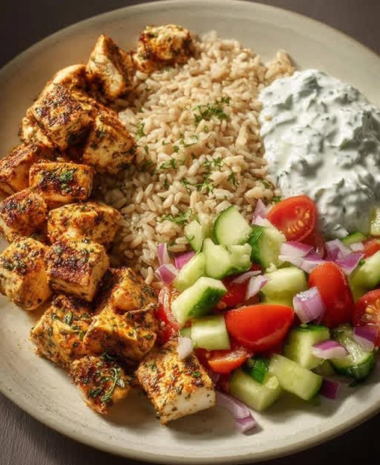 - Assemble: Add rice to bowls, top with chicken, salad, and a spoon of tzatziki. Garnish with parsley.