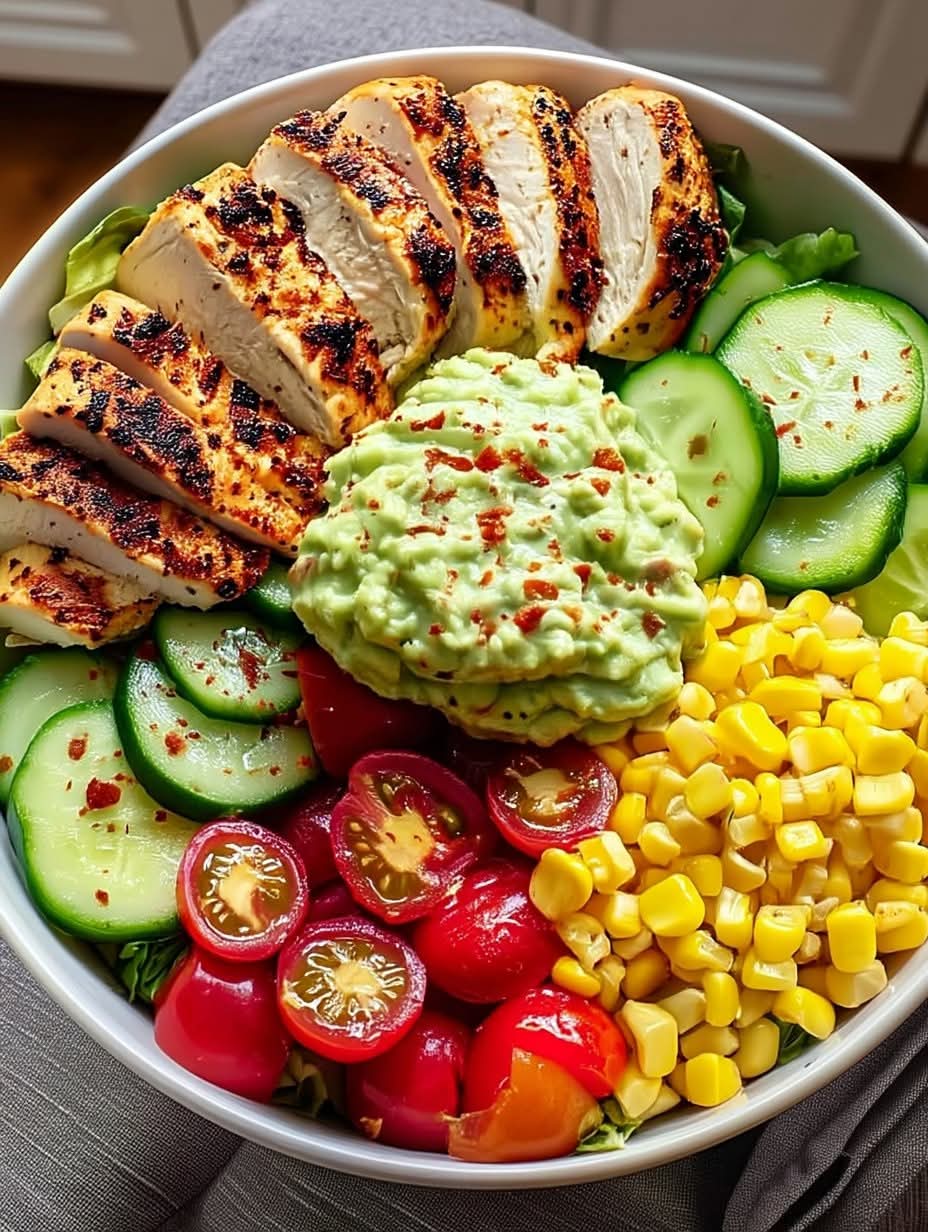Grilled Chicken Salad Bowl with Guacamole, Corn & Crunchy Veggies