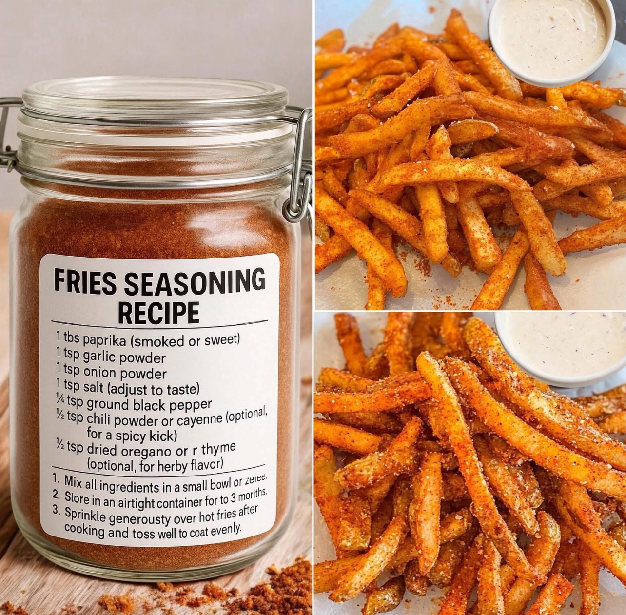 Make your fries go from plain to flavorful in seconds with this simple DIY seasoning blend! Just mix, store, and sprinkle. Perfect for fries, wedges, or even popcorn. 💯