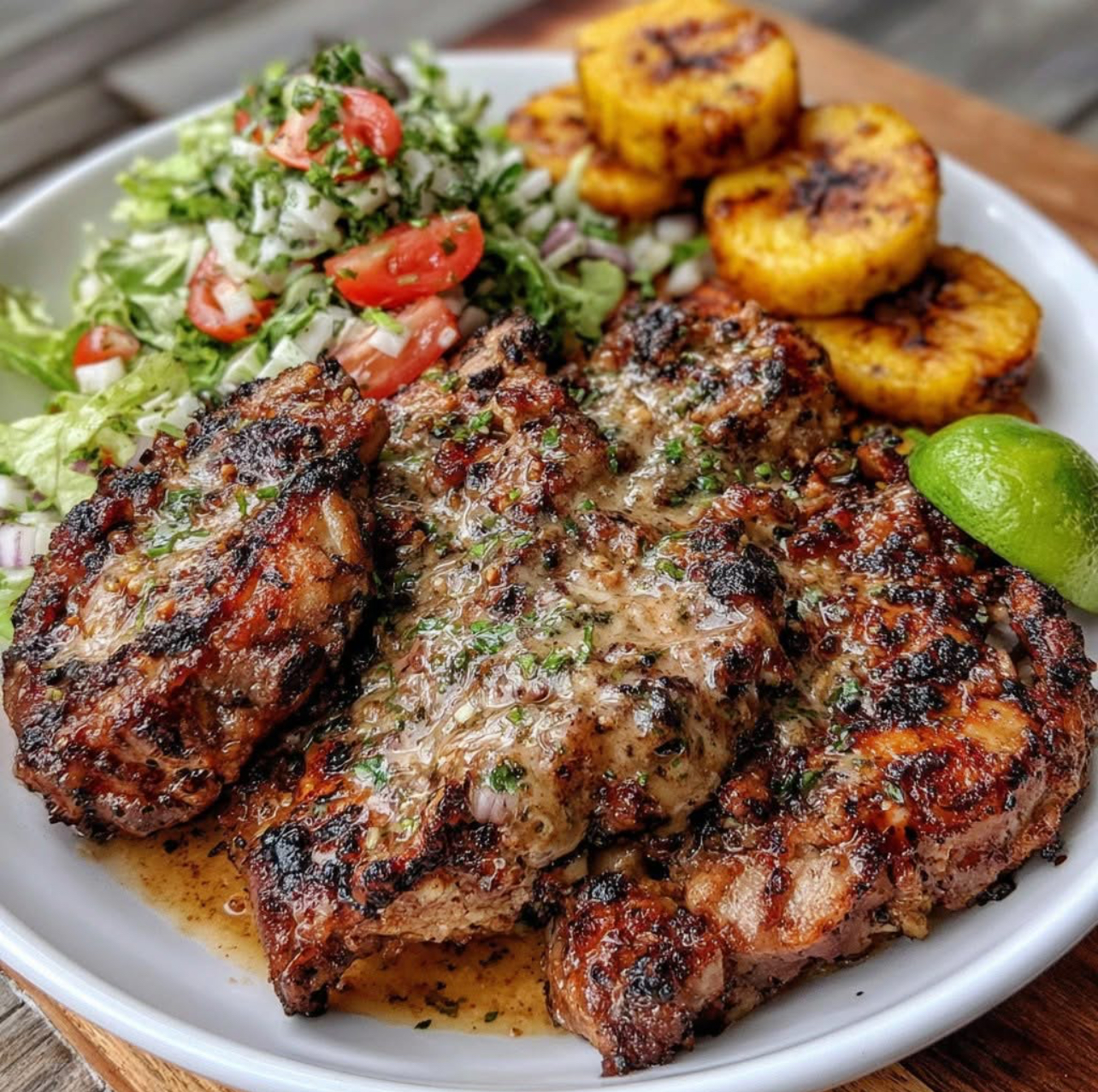 Plate the jerk pork with caramelized plantains.