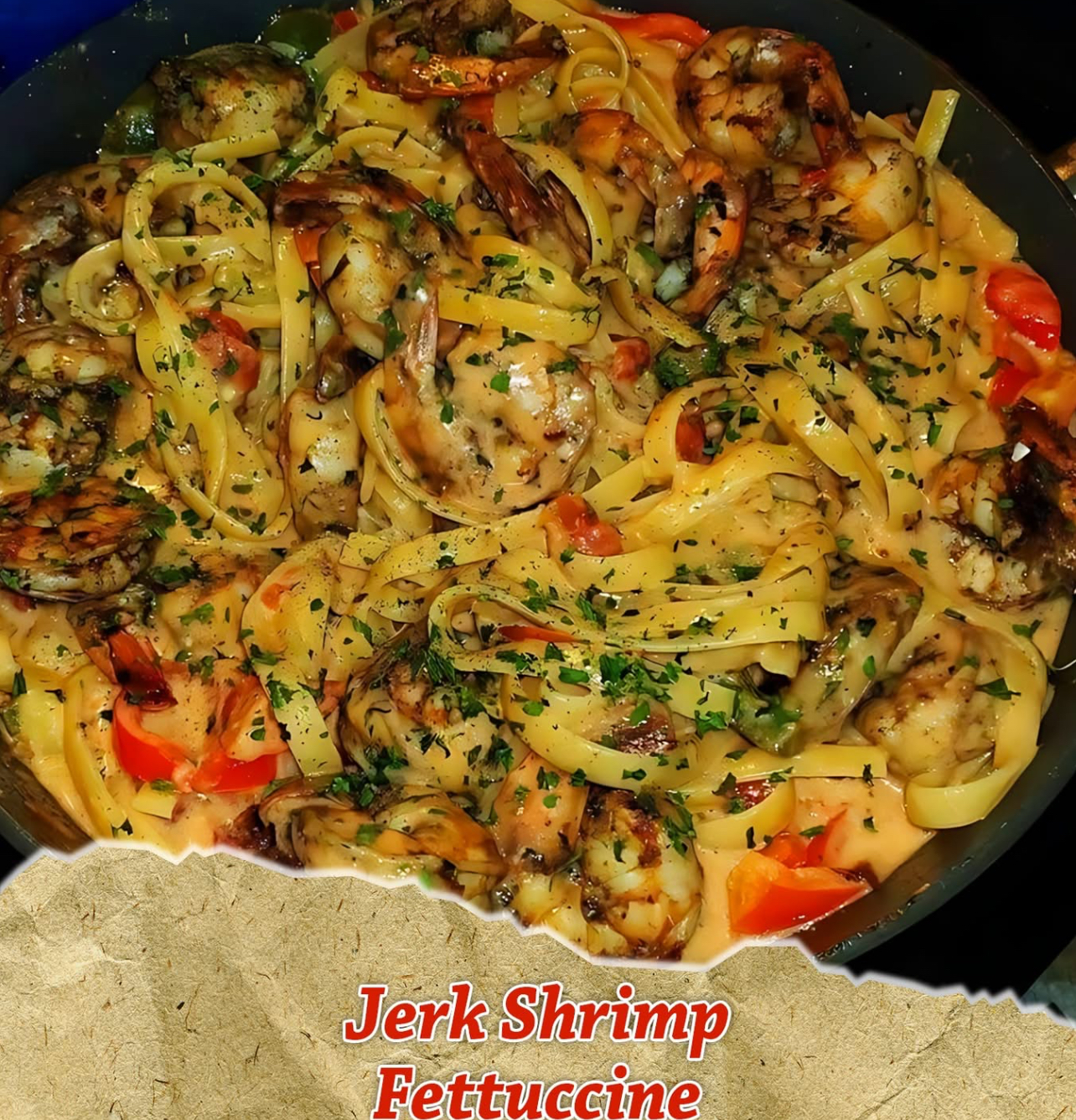 Sauté the shrimp with jerk seasoning, sofrito, and diced garlic. Set aside and reserve the juices.