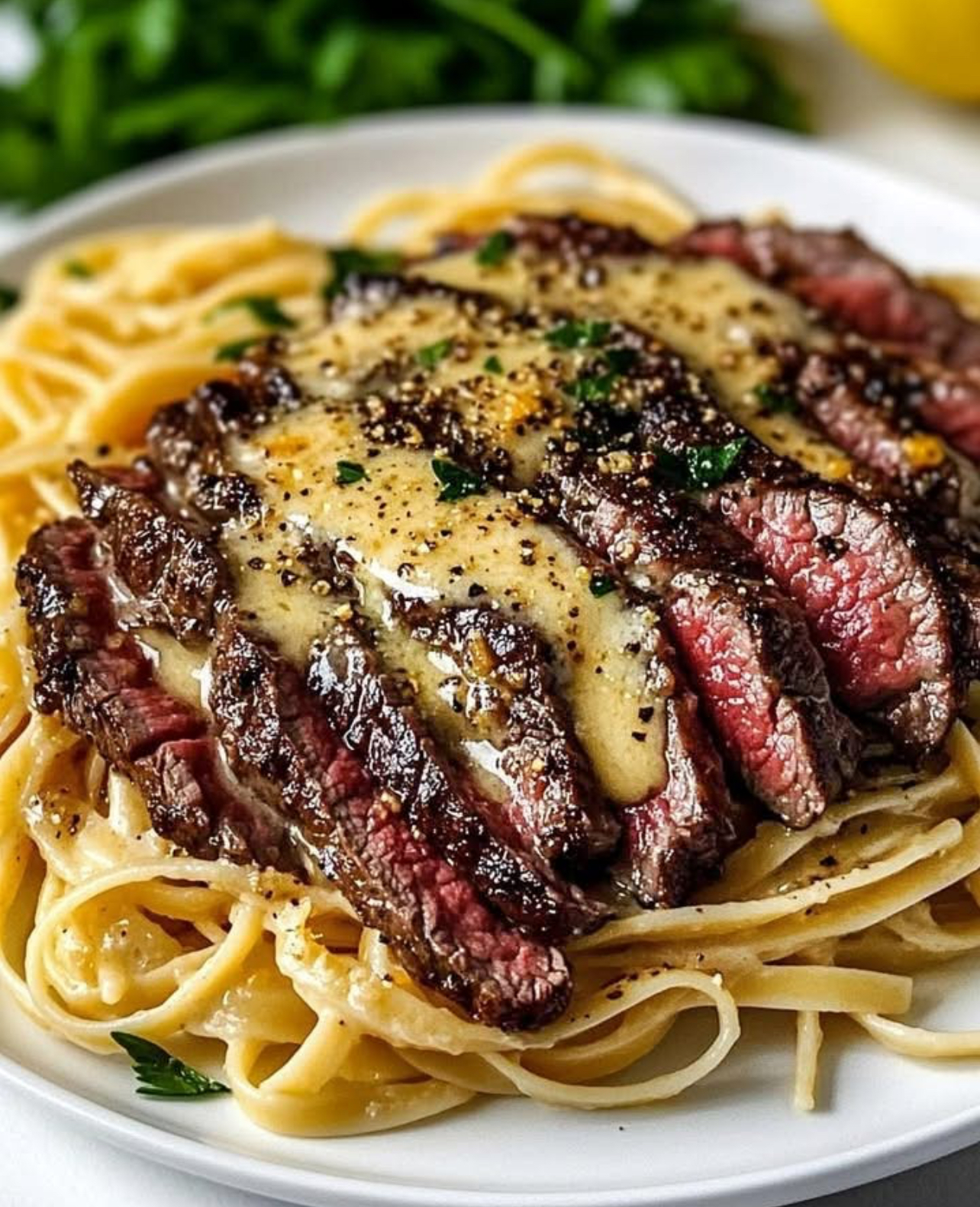 Drizzle any remaining garlic butter sauce over the steak and pasta. Garnish with freshly cracked black pepper, parsley, and lemon wedges.