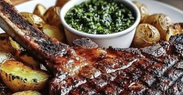 Slice steak against the grain. Serve with charred potatoes and spoon chimichurri generously over the steak.