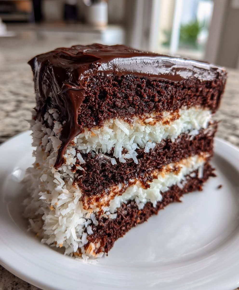 - Pour the chocolate ganache over the coconut layer, spreading it evenly.
