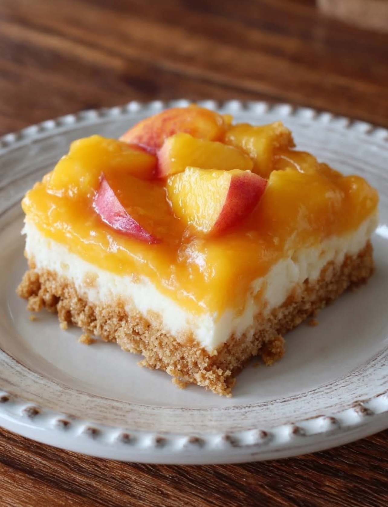 Prepare the peach topping: In a saucepan, combine diced peaches, lemon juice, and sugar. Cook over medium heat for 5–7 minutes until peaches soften and the mixture thickens slightly. Remove from heat and let cool.