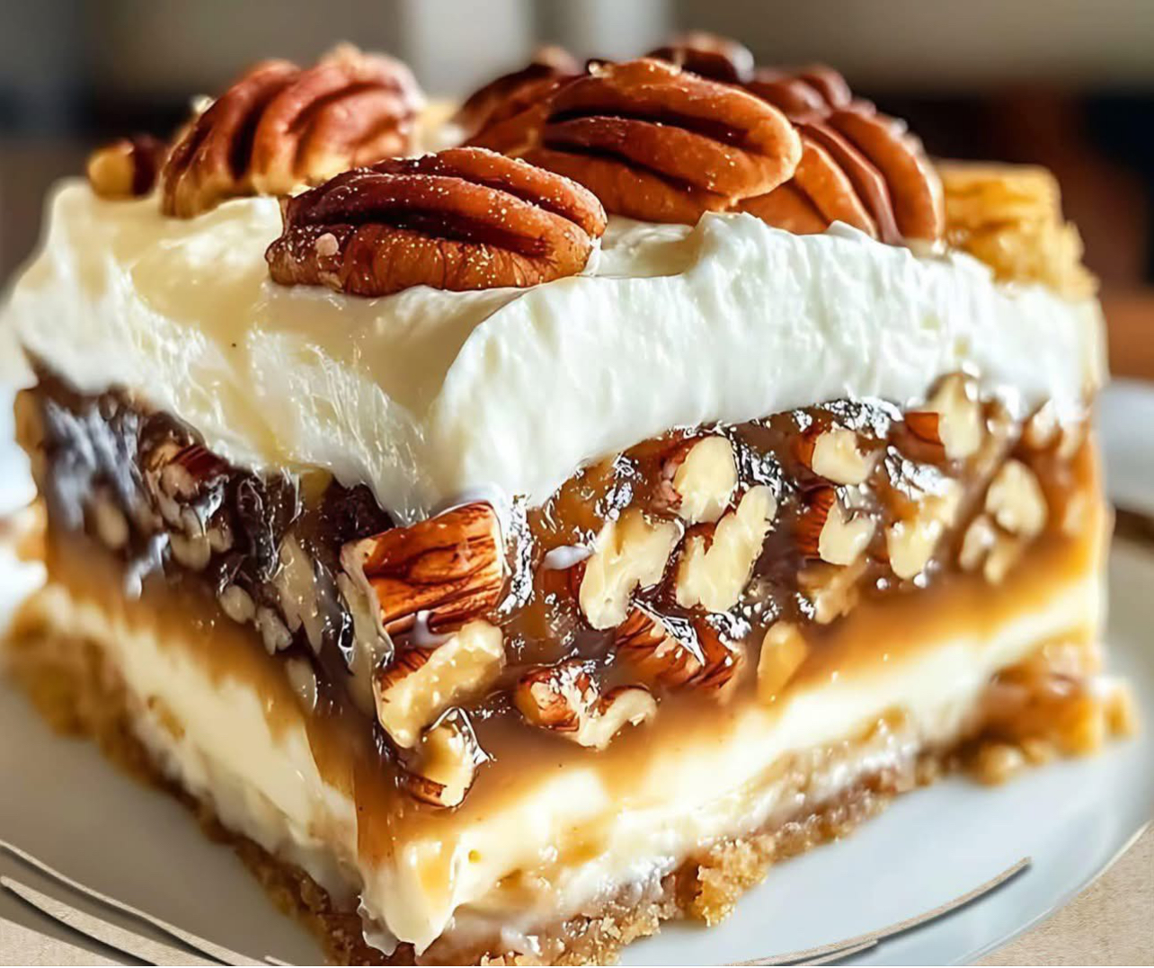 Whip the heavy cream with powdered sugar until stiff peaks form. In a separate bowl, mix the mascarpone cheese with the cooled, dissolved gelatin. Gently fold the whipped cream into the mascarpone mixture. Spread this cream layer evenly over the nut layer.