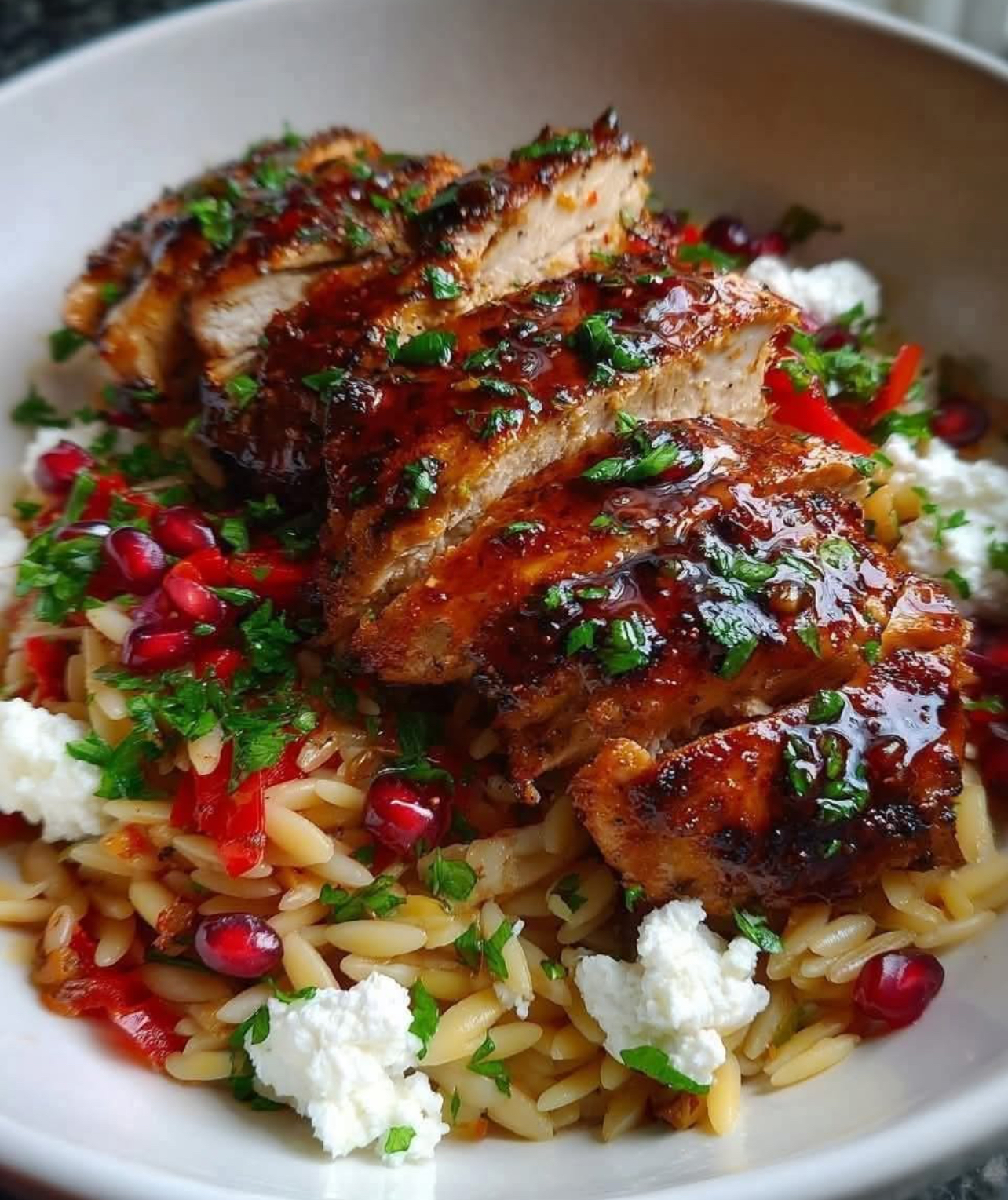 Plate the orzo and top with sliced chicken. Drizzle with extra pomegranate molasses if desired and garnish with more parsley.