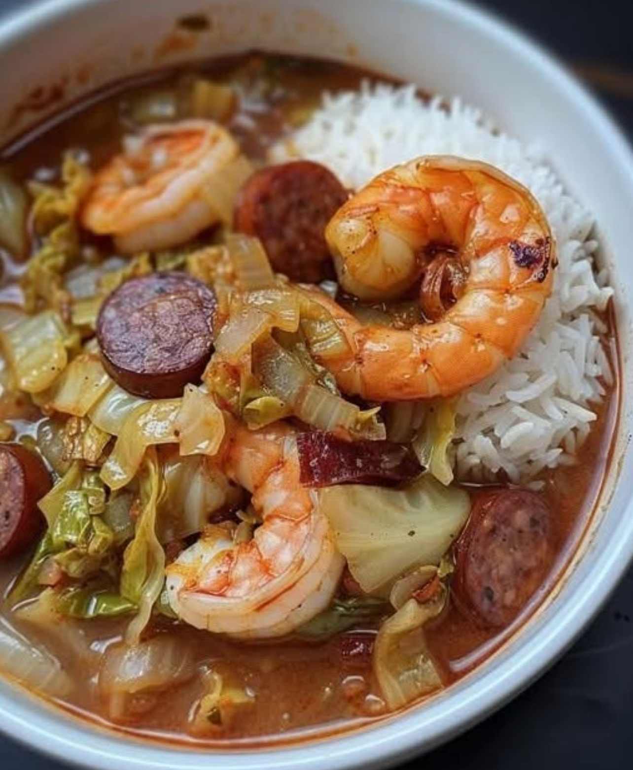 - Spoon the smothered cabbage, sausage, shrimp, and broth around the rice.
