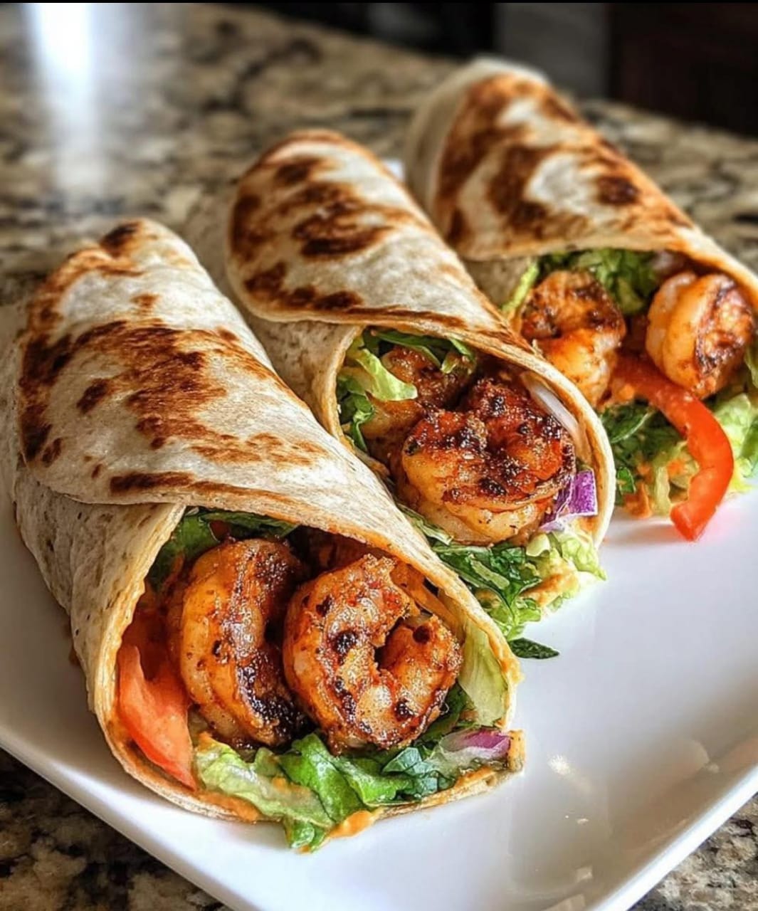 Lay down lettuce, peppers, onion, shrimp, and a drizzle of sauce. This combo makes every bite burst with smoky, tangy crunch.