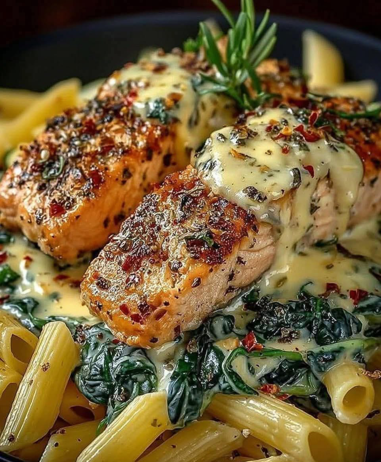 Place seared salmon on top of the pasta, garnish with parsley and extra Parmesan, and serve warm.